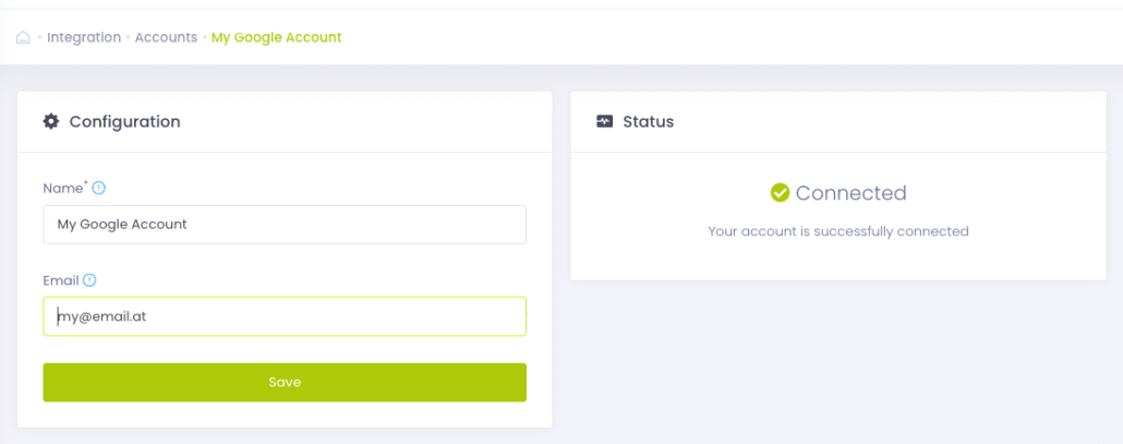 Wenn Sie die benötigten Berechtigungen bestätigt haben, werden Sie auf die Seite Ihres neuen Integration Accounts weitergeleitet. Dort wird sofort der Verknüpfungsstatus Ihres Kontos dargestellt.